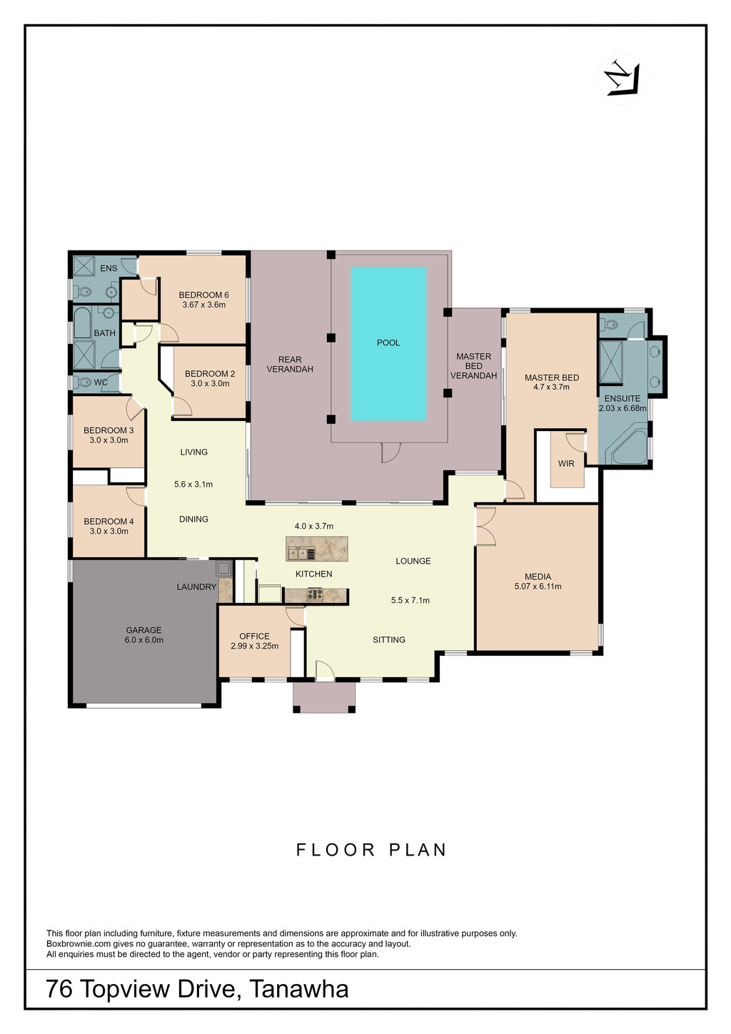 Complete with five bedrooms, office/6th bedroom, three bathrooms, two open plan living areas separated by a light-filled central kitchen, separate media room, wraparound alfresco terrace, and double lock up garage; with 264m2 floor space under roof, this is a substantial sized home.