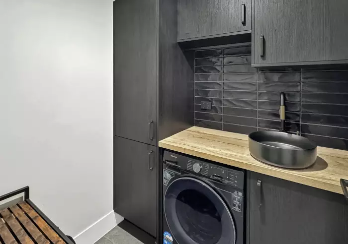 The master suite includes balcony access, a walk-in robe and private ensuite. The second bedroom is thoughtfully separated for privacy, and a cleverly integrated study nook offers the ideal work-from-home or creative space. A full-size laundry and powder room add to the functionality rarely seen in apartment living.
