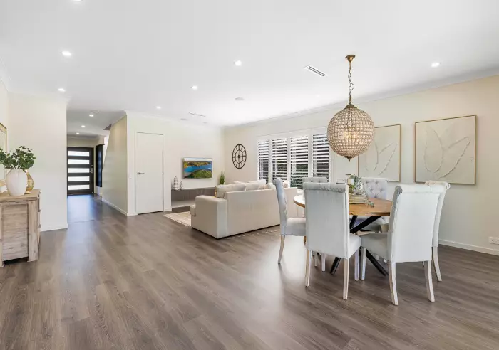 From the moment you step inside, the sense of space is immediate, with high ceilings flowing throughout the home. The heart of the residence is a stunning open-plan kitchen fitted with Blanco gas cooking, a butler's pantry, and abundant storage. Ducted air conditioning ensures year-round comfort, while internal Yamaha speakers set the mood for entertaining.