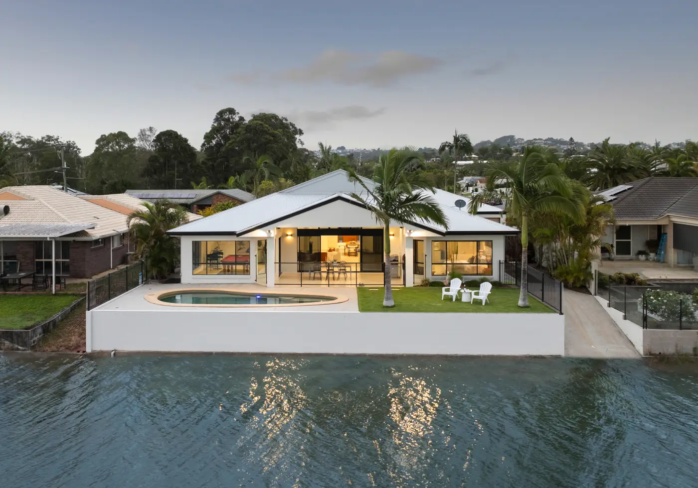 The large master bedroom, granite kitchen with quality appliances and the open plan living areas seamlessly flow to the huge outdoor entertaining area which all enjoy elevated panoramic water views whilst also overlooking the pool and manicured zoysia grassed yard.