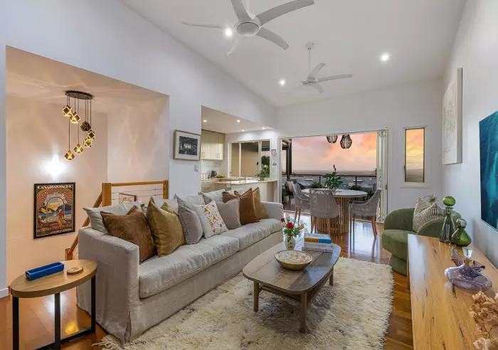 The upper level is where day-to-day life unfolds. From the secure double lock up garage, you enter straight into the front door where you are greeted by the views, modern kitchen and open-plan living area. High ceilings, powder room, timber floors and natural light create a warm, inviting feel, flowing to a generous entertainer's deck with glass balustrades where the views become part of everyday living.