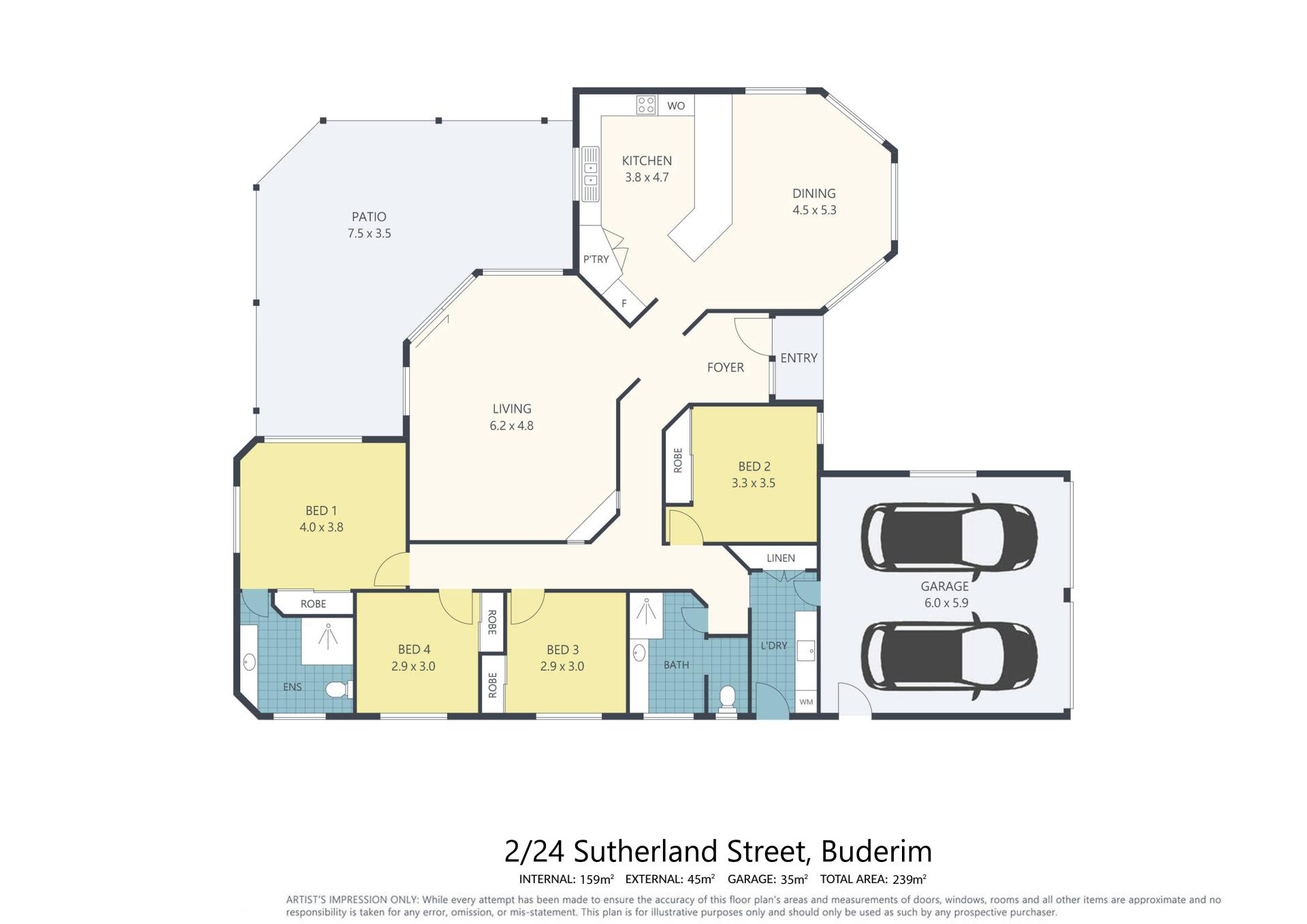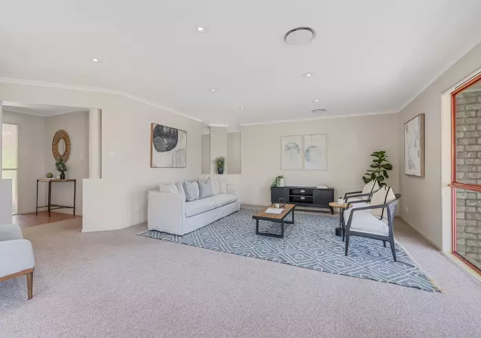 The home unfolds across a spacious and practical layout with four bedrooms, two bathrooms, two living areas and a central kitchen that forms the heart of the residence. A covered north-east facing alfresco patio invites year-round outdoor living, capturing natural light and gentle breezes, while the master suite opens directly to this tranquil space.