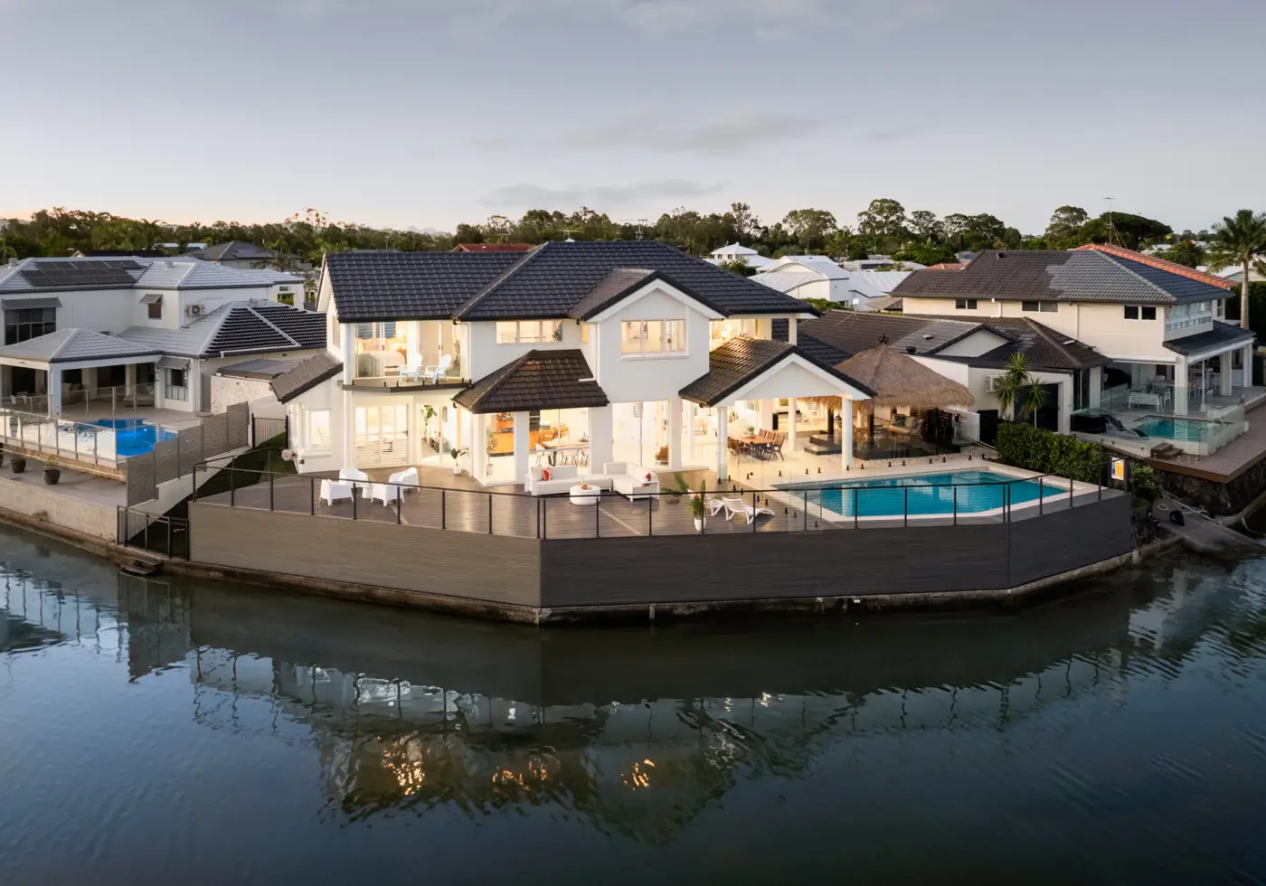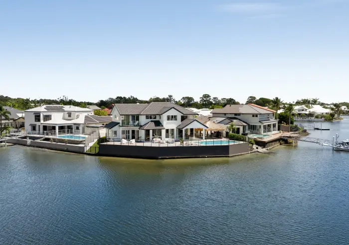 Three bedrooms are on the lower level which include the master bedroom that leads out to a private sitting area and overlook the newly thatched gazebo, refurbished pool and canal whilst the centralised kitchen with granite benchtops, multiple living areas including the media room all fan out to ensure that the sprawling panoramic water views are enjoyed from every space.