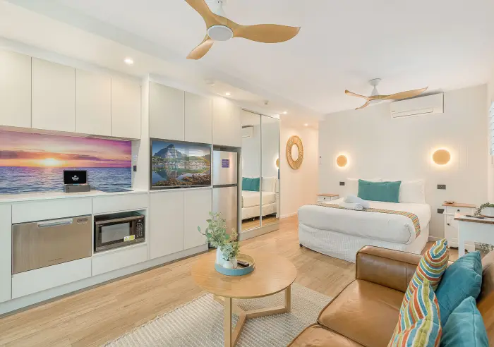 Immaculately presented, the apartment is sold fully furnished with high-quality fixtures and finishes. Boasting 9-foot ceilings, a spacious bathroom, and bonus side windows that flood the space with natural light, it also features ducted air-conditioning and ceiling fans for year-round comfort.