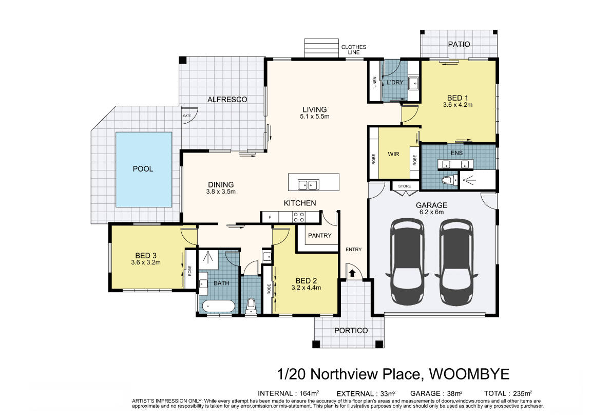 • Three bedrooms, two bathrooms, double garage