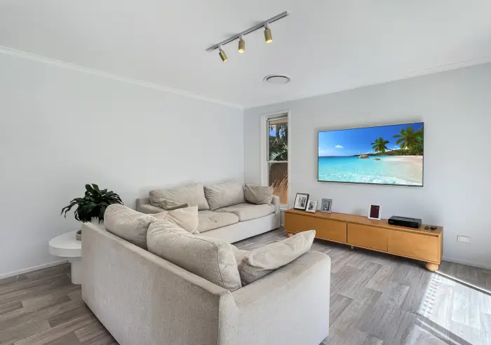 Bathed in natural light, the open-plan living and kitchen area is framed by raked ceilings, creating a sense of space and airiness that immediately feels like home. The layout is both functional and inviting, designed for everyday living while still offering a place to relax and unwind.